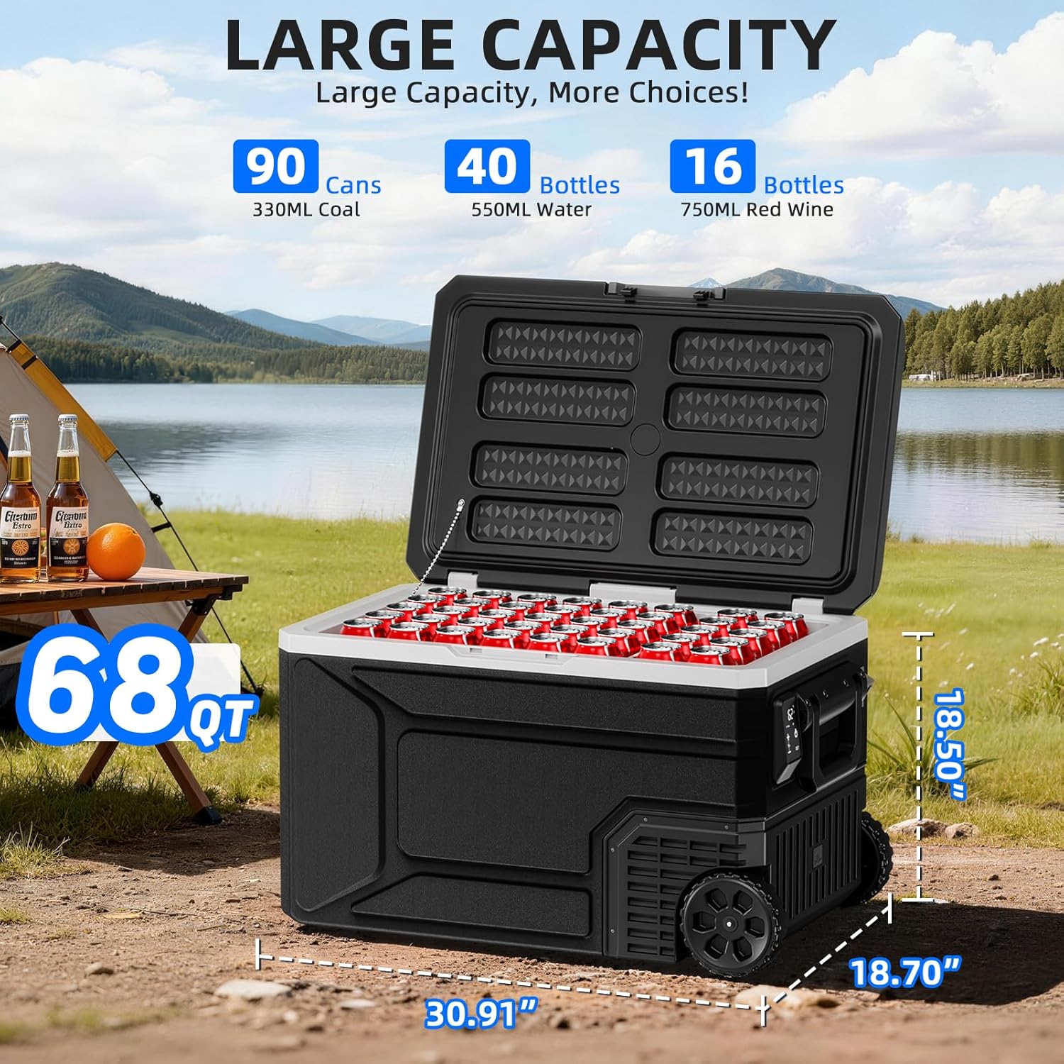 Massive Capacity with a Dominant Freezer-Sized Compartment. Unmatched storage flexibility with two compartments, featuring a massive 52.5L main section paired with an 11.5L top section. Ideal for converting the entire unit into a large-capacity freezer for bulk meat, game, or ice, or a gigantic refrigerator for group gatherings and extended off-grid living.