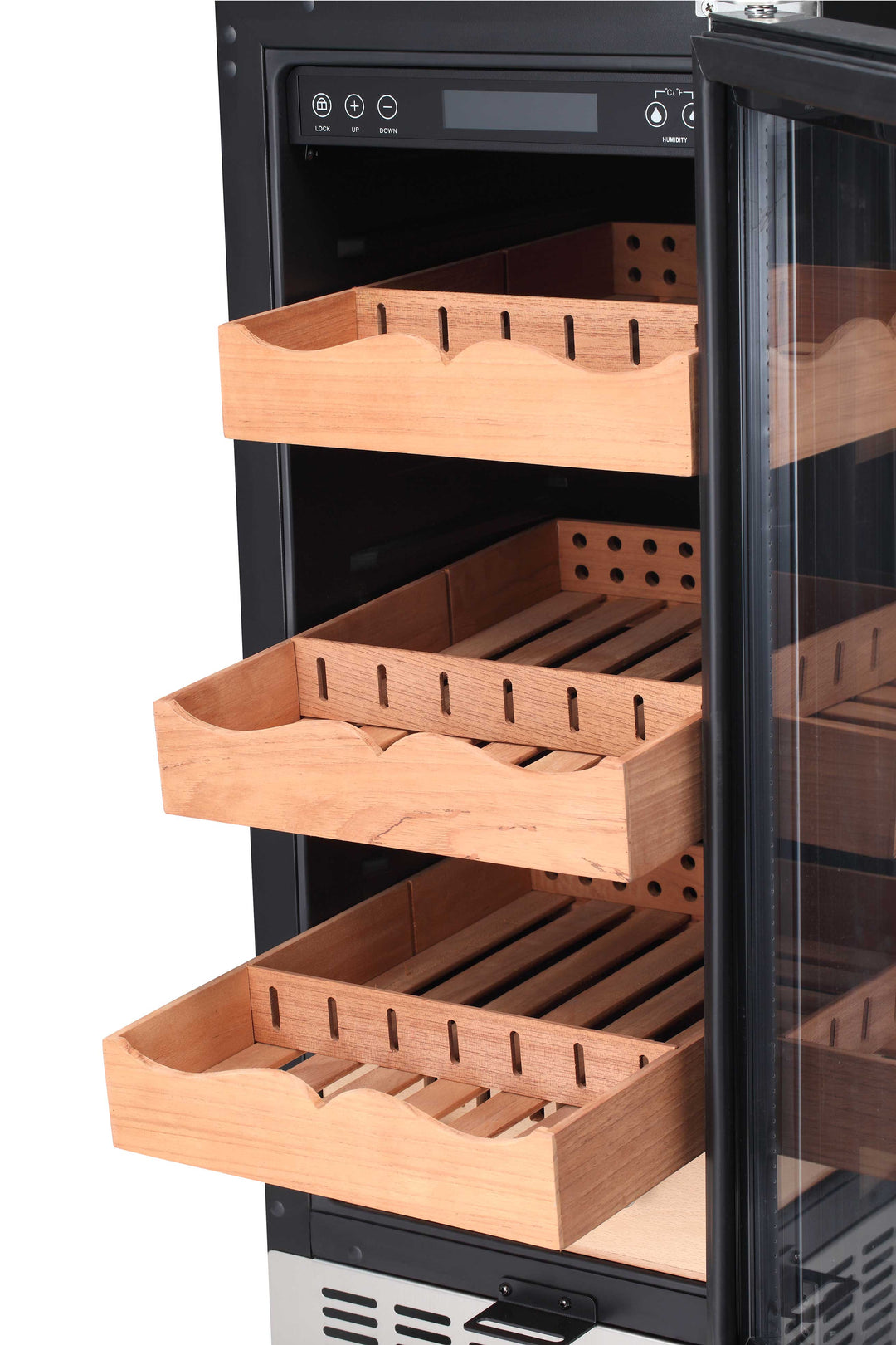 This humidor provide 2 justable wooden shelves and 1 adjustable wooden drawers, large capacity is enough to hold it with 3.61 cu ft .