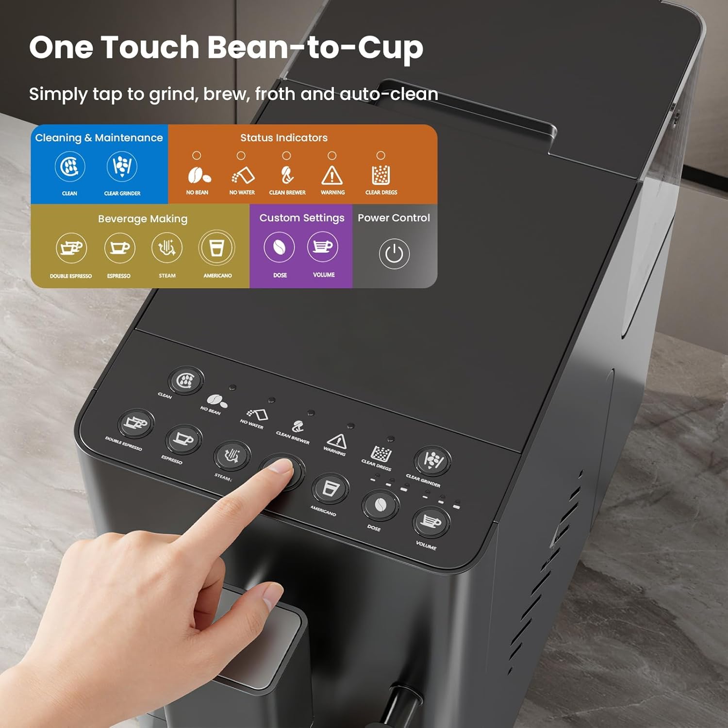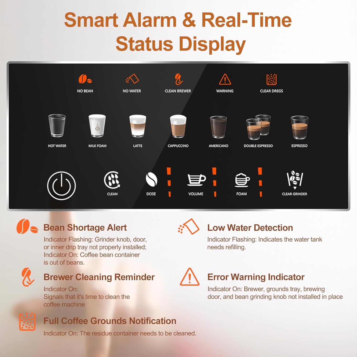 【Precise Status Light Reminders】Get real-time reminders to refill water or beans, clean the brewer, and descale. This espresso machine prevents incomplete brews, stale flavors, and internal damage—so you enjoy fresh, consistent coffee without the guesswork.