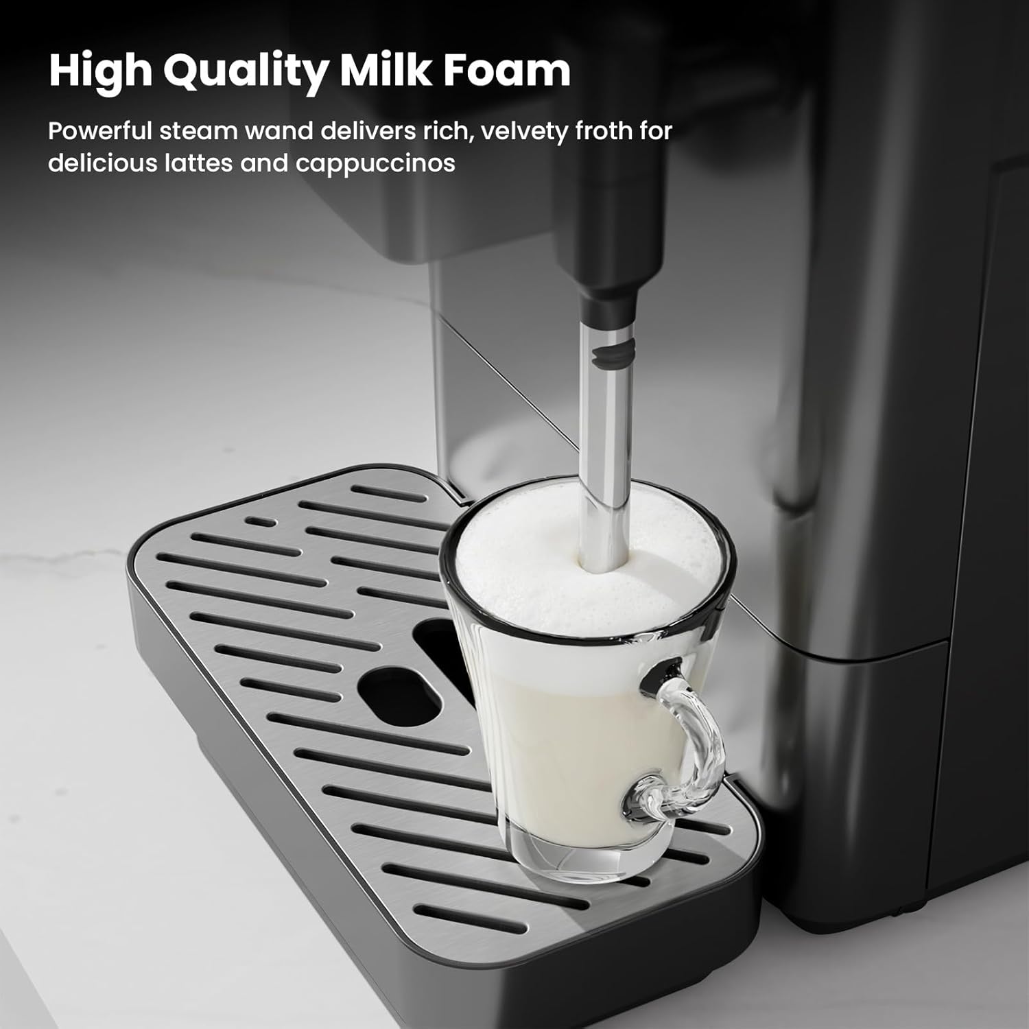 【Powerful & Stable Pressure System】 Equipped with a 20-bar pump, this cappuccino machine ensures the rich flavor of your coffee beans is fully released in every cup. Its 1350W high-power system automatically maintains a constant water temperature, ensuring that every brew is at the optimal temperature.