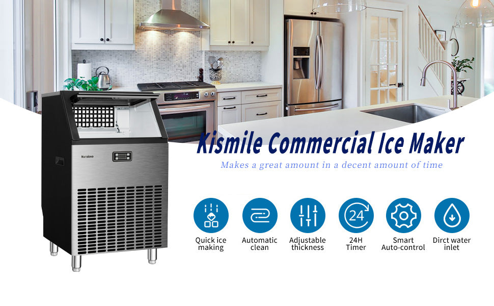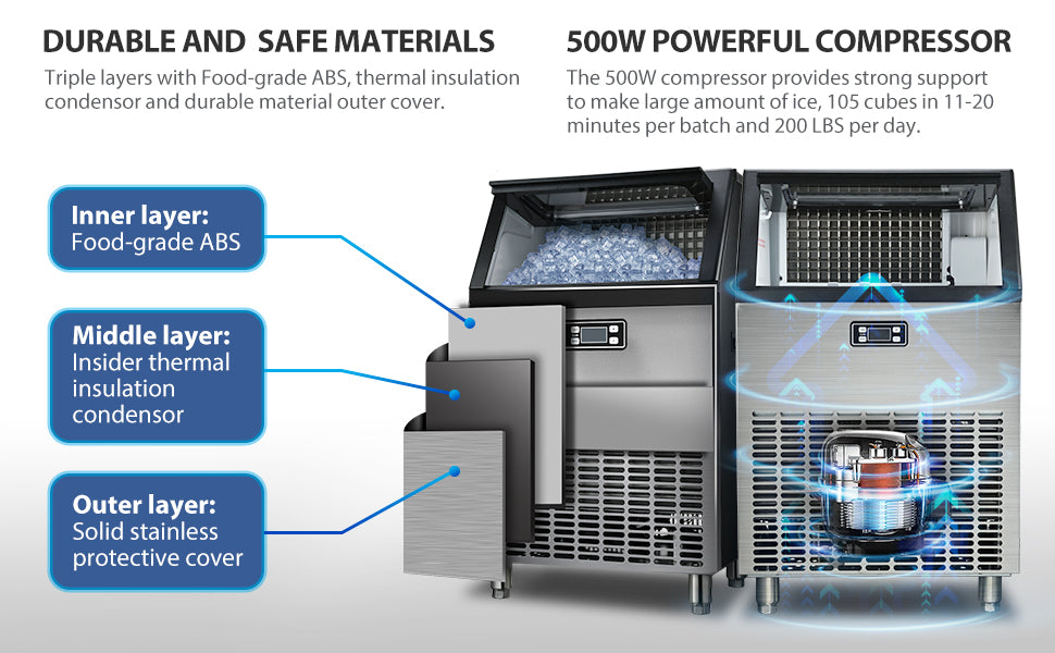 • Fast Ice Making: Our commercial ice maker produce 45/105/120 ice cube per batch, being more times than the ice prepared by general daily ice maker machine. 33/48/48 lbs ice storage allows you to enjoy adequate ice when you need. And 100/200/265 lbs daily ice output satisfies you with high demands of ice.