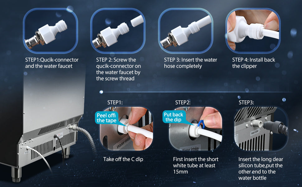 You can get water in two ways: a mineral water bucket or a hose. At the same time, the ice machine has a special outlet to drain dirty water.