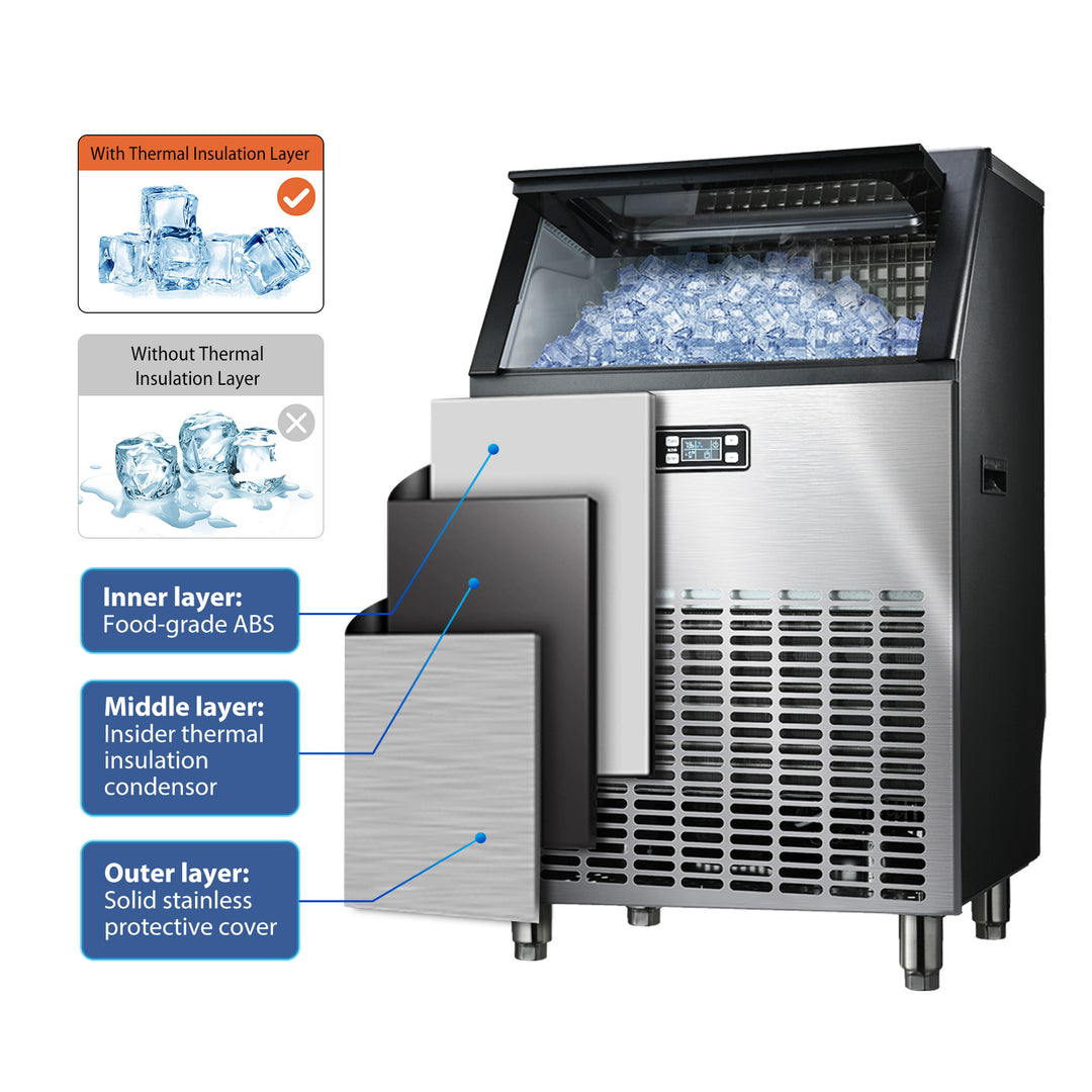 • Fast Ice Making: Our commercial ice maker produce 45/105/120 ice cube per batch, being more times than the ice prepared by general daily ice maker machine. 33/48/48 lbs ice storage allows you to enjoy adequate ice when you need. And 100/200/265 lbs daily ice output satisfies you with high demands of ice.