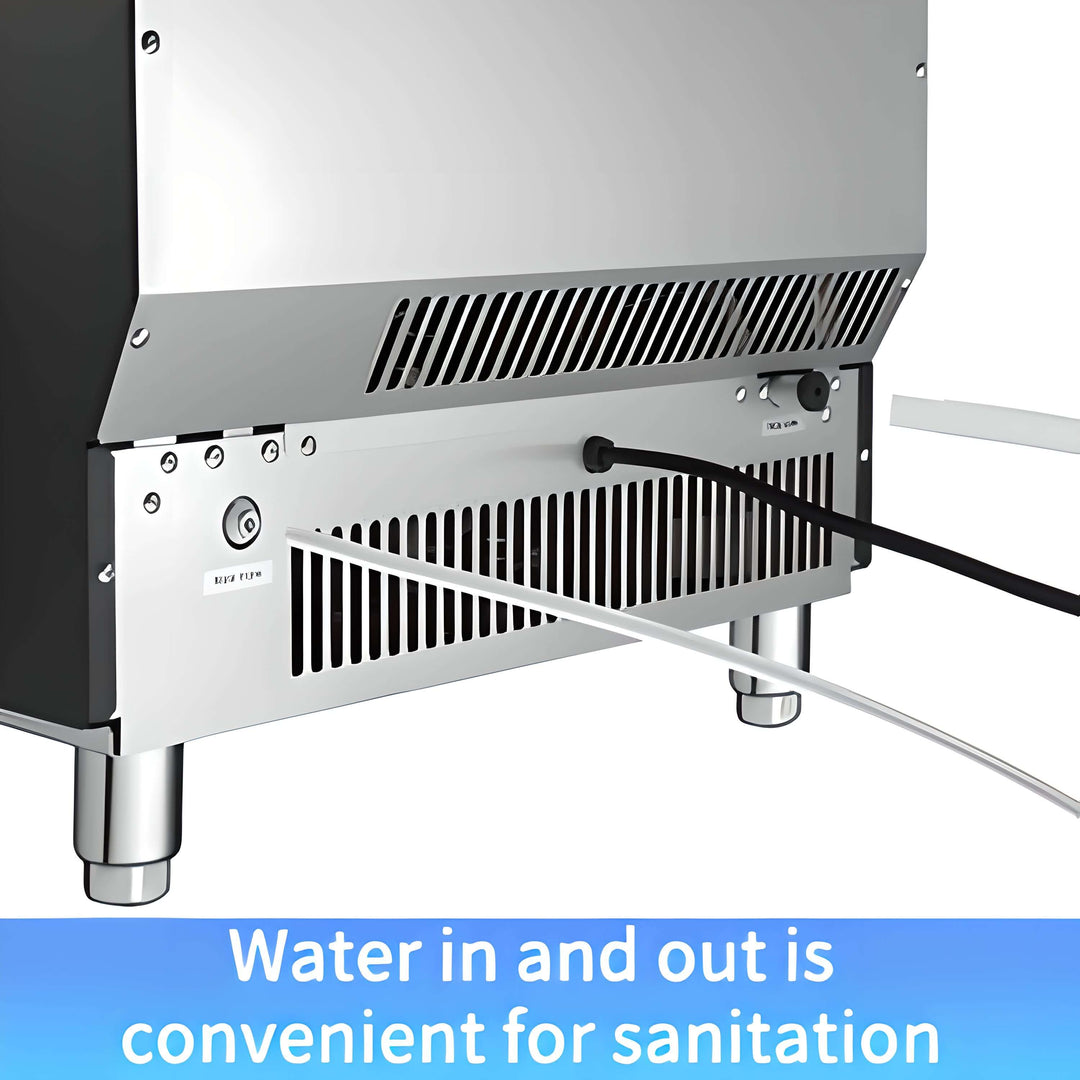 You can get water in two ways: a mineral water bucket or a hose. At the same time, the ice machine has a special outlet to drain dirty water.