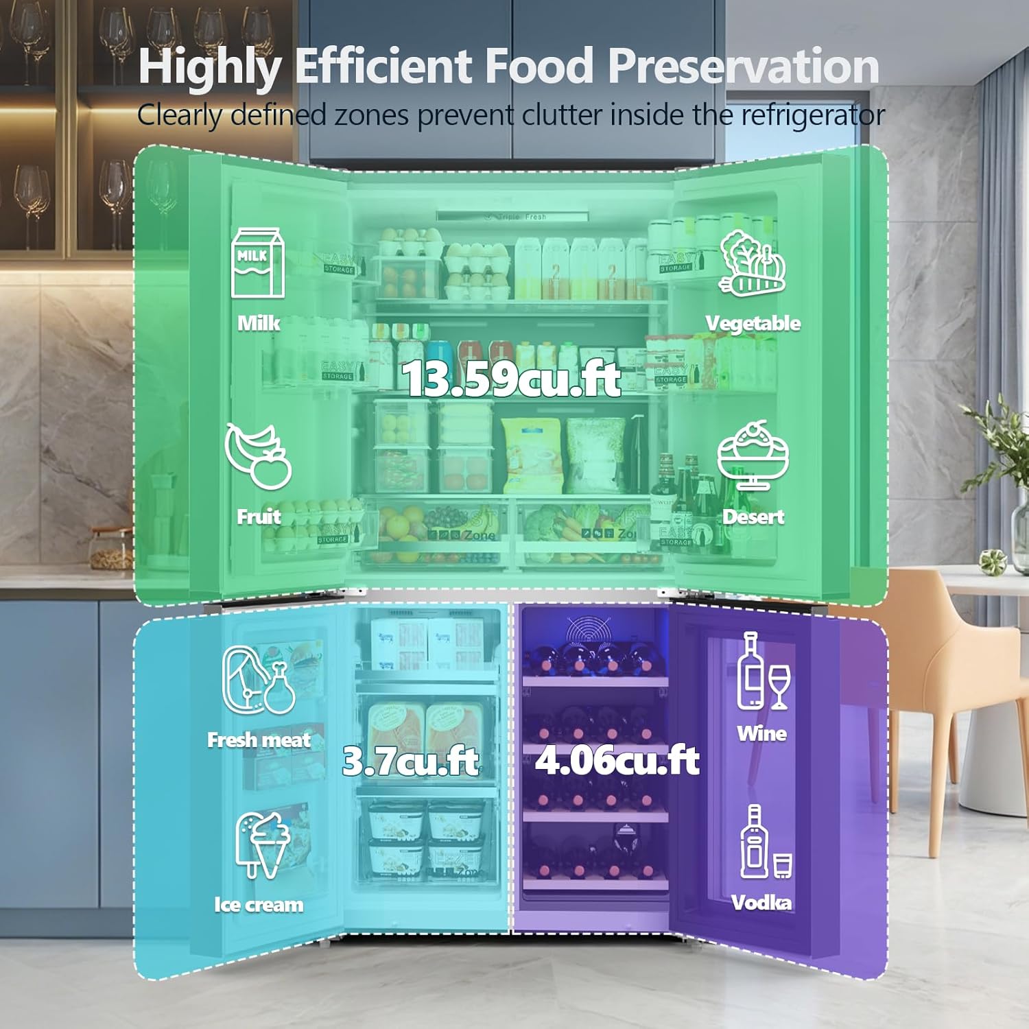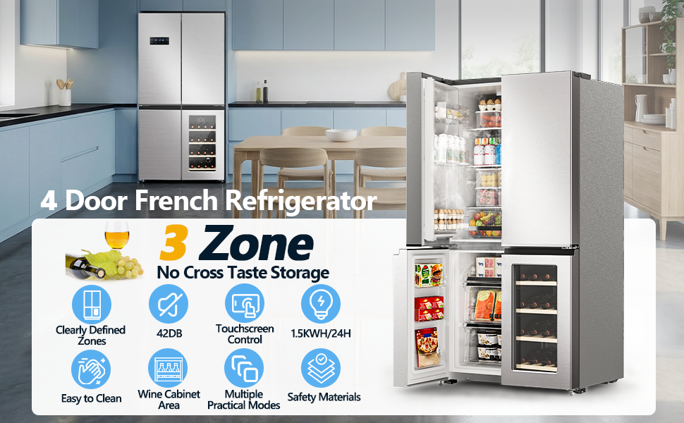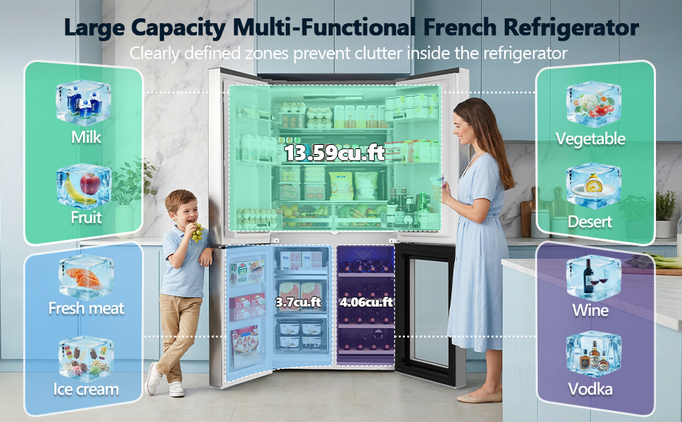 【French Design & Smart Sizing】The premium French refrigerator is a good choice among French door and counter-depth refrigerators. It features built-in handles, a sleek stainless steel finish, and measures 71.65 in(H) x 35.63 in(W) x 28.35 in(D). With a large refrigerator it offers 21.36 Cu.Ft clear zoning: a full upper refrigeration compartment, a lower left freezer, and a lower right wine cabinet, maximizing kitchen space.