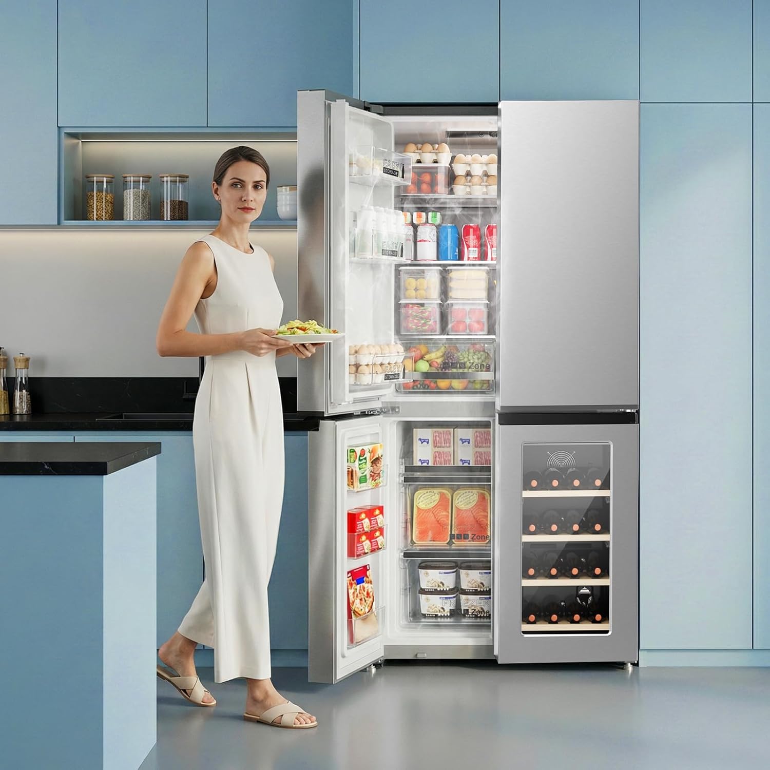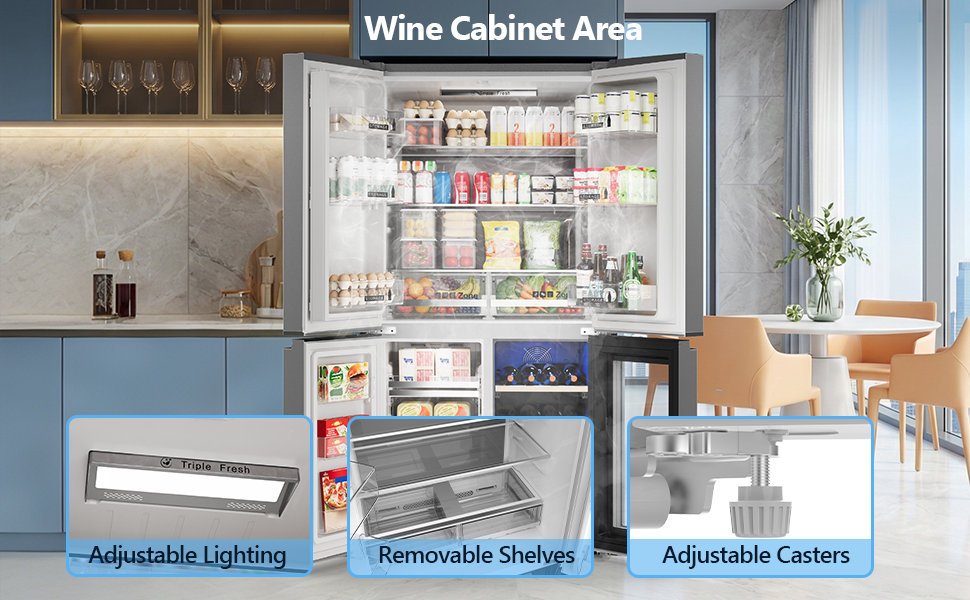 【Independent Control】Offers independent zone control: Refrigerator (36°F to 47°F), Freezer (-18°F to -13°F), and Wine Cabinet (-41°F to -65°F) with storage flexibility similar to side-by-side refrigerators. The fridge has low energy(1.5 kWh/24h) consumption and low noise(42 dB).