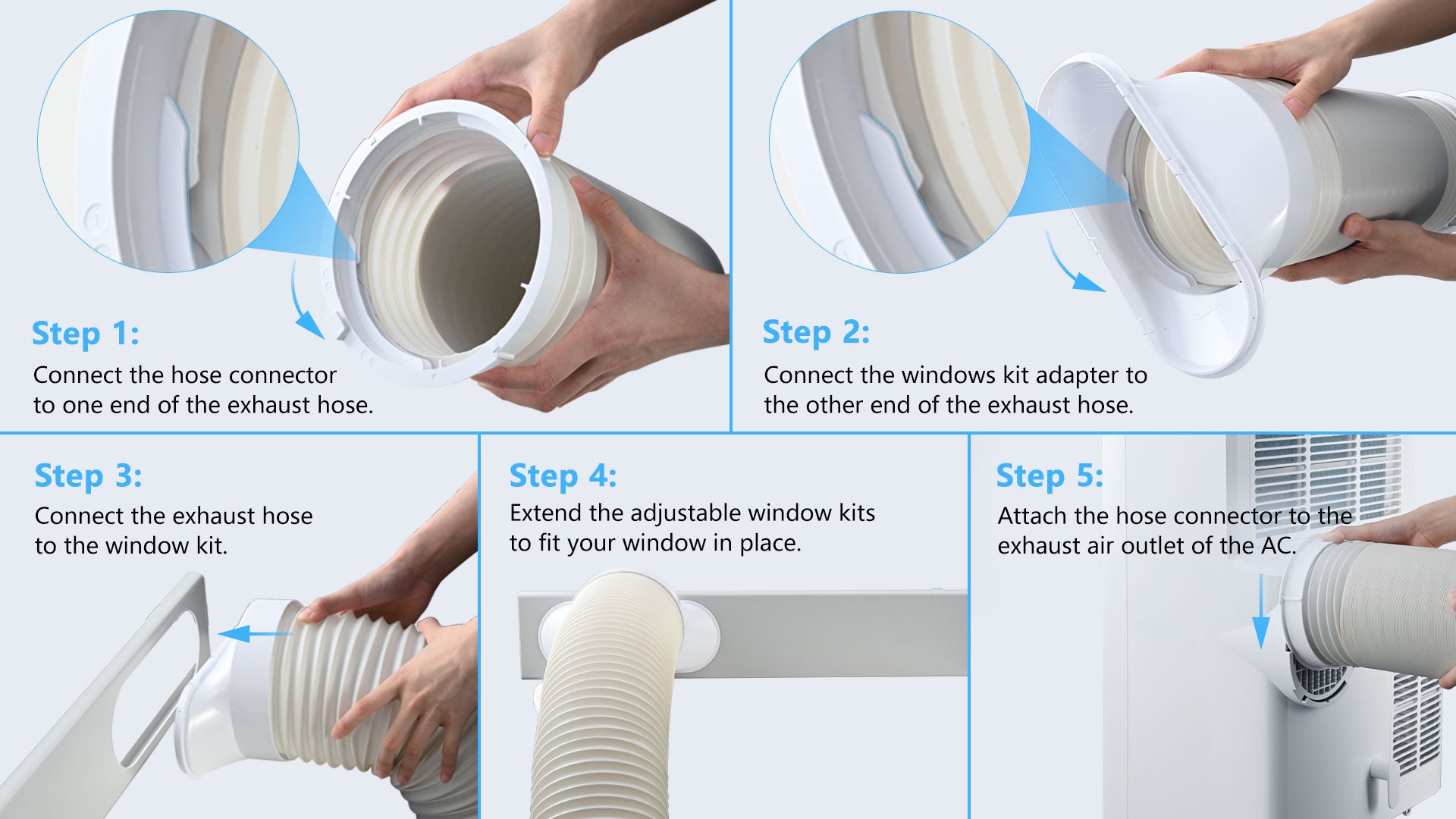 So our portable air conditioner is coming with a top configuration including dehumidification, 3 adjustable fan speeds, 24H smart timer, washable air filter and universal Wheels. For your convenience, we also have arranged all the accessories you may need.