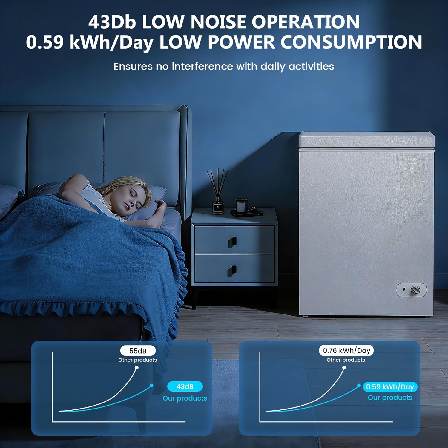 【High Efficiency & Energy Saving】 Our chest freezers consume only 0.6kWh of electricity per day, and only costs $30 a year. Equipped with a high-performance R600a compressor and 4D rapid cooling technology, our compact freezer can cool down food in just 5 minutes with 43 dB operating noise.