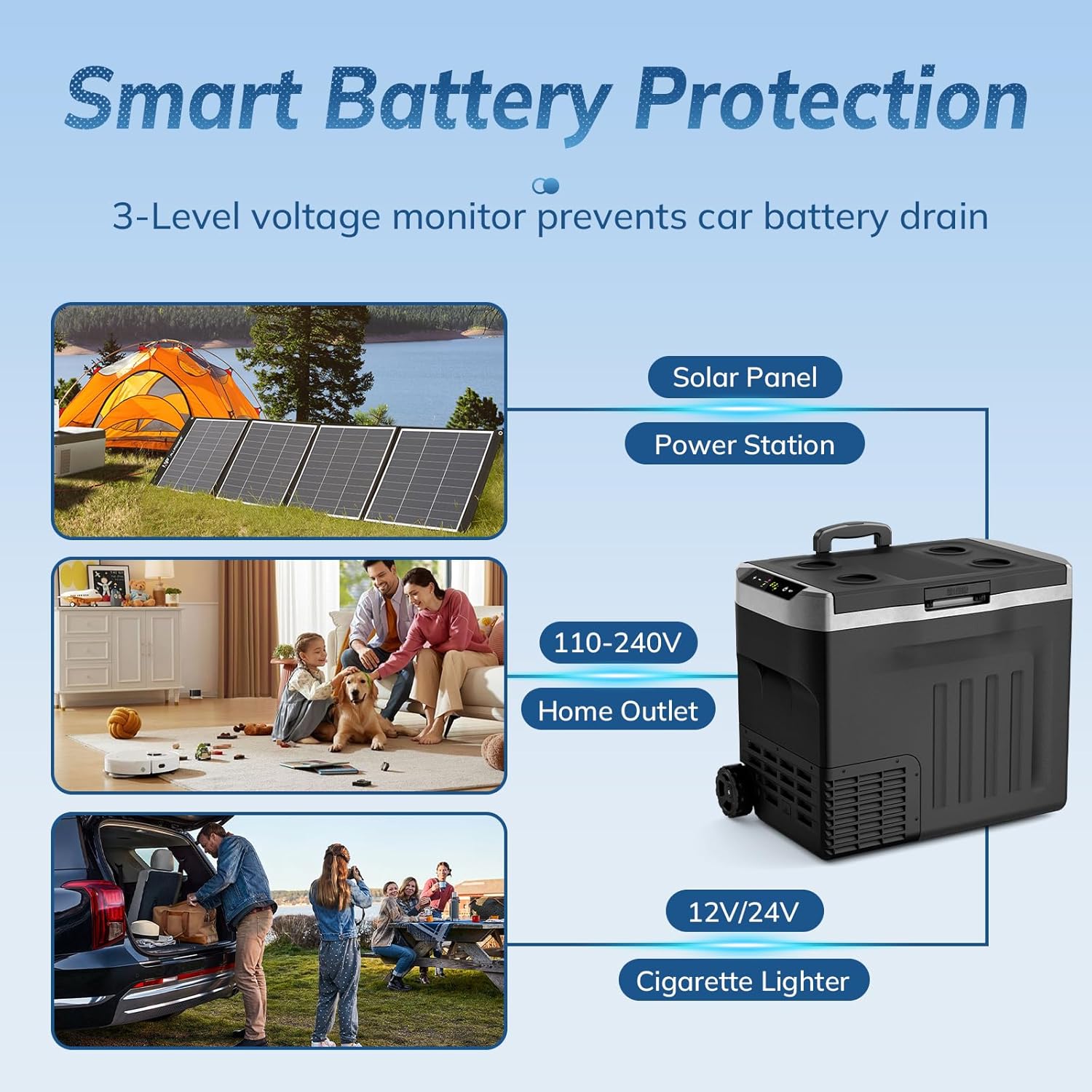 {Intelligent Electronic Control & Power Protection}-Antarctic Star Car refrigerator features a smart and precise electronic control panel, allowing real time adjustment of the desired temperature. Equipped with a 3 level battery protection function (H/M/L), it safeguards the unit when connected to power sources of varying voltages, enabling compatibility with different voltage inputs. This effectively prevents overloads or battery depletion, ensuring efficient protection for your vehicle/battery system.