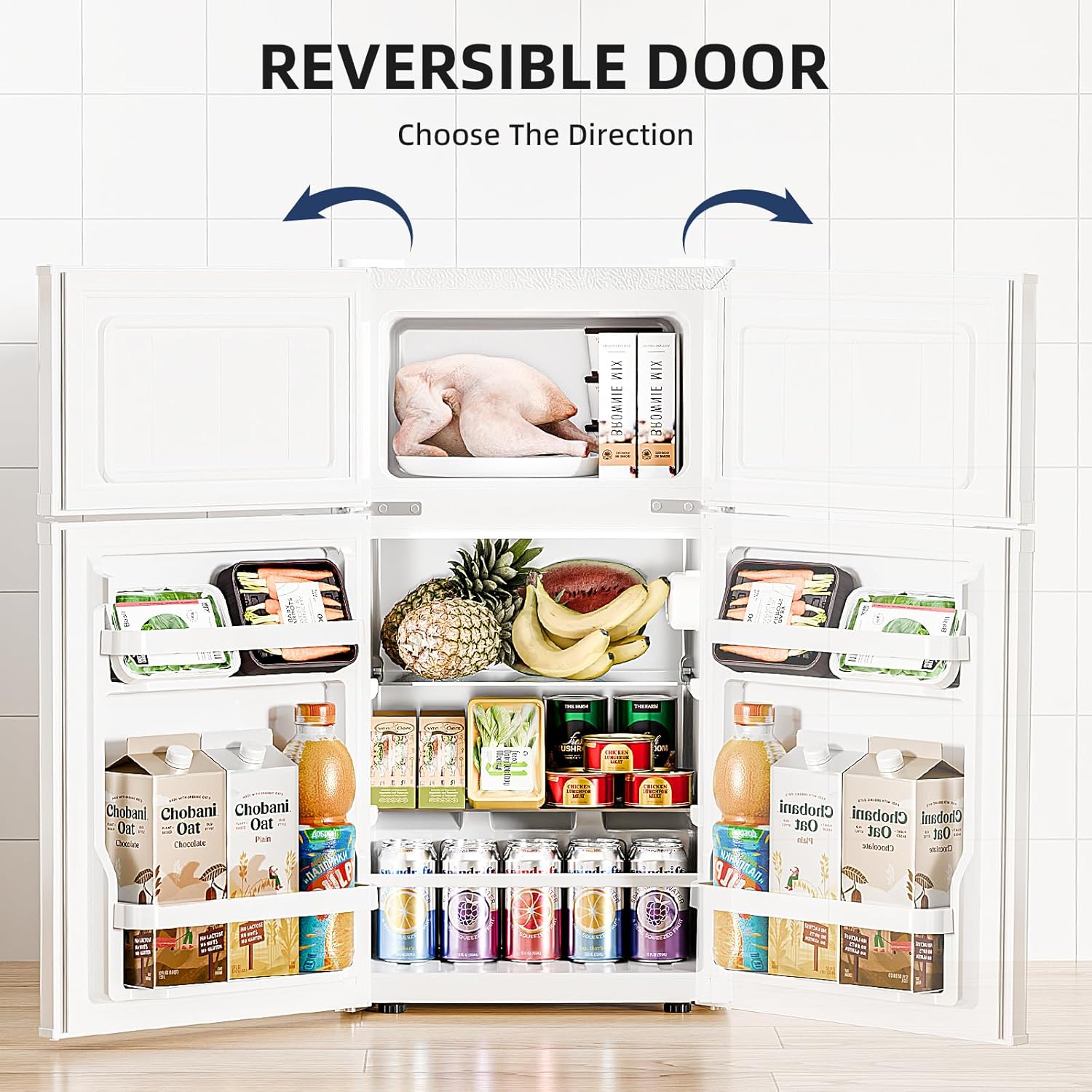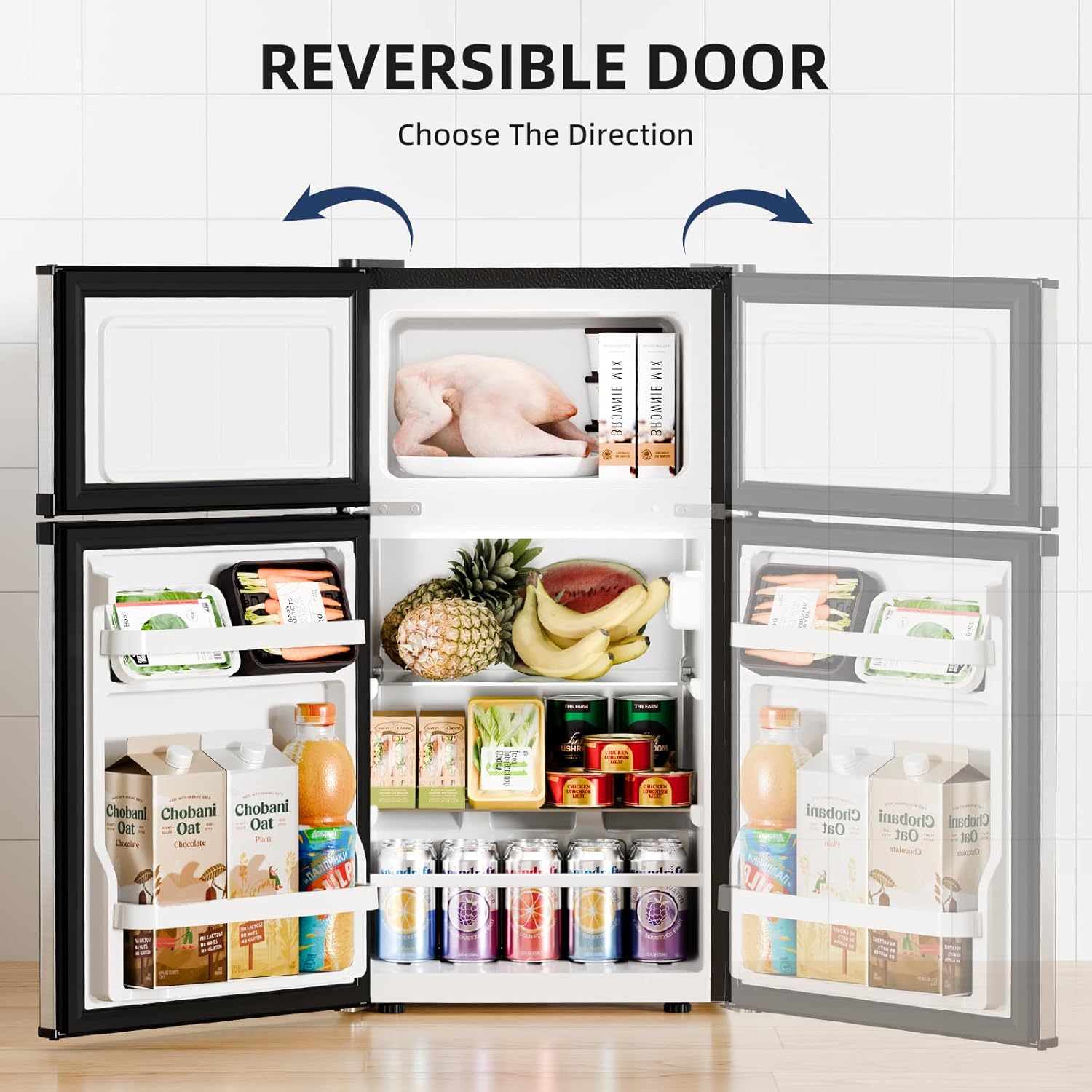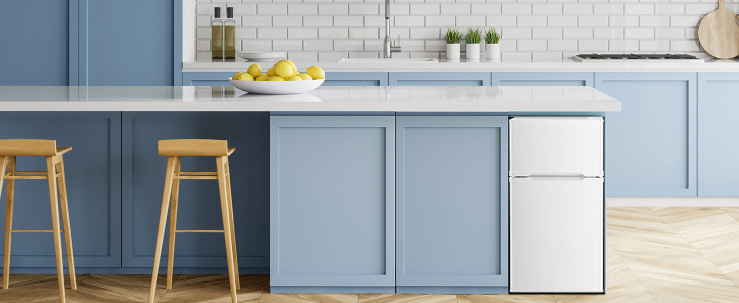 Double Door Design with Separate Freezer Compartment: This compact refrigerator features a top freezer and bottom refrigerator with independent doors, allowing you to access frozen foods and chilled items separately without cold air loss. The refrigerator compartment is equipped with two sturdy glass shelves and a door bin, providing flexible storage for beverages, fruits, and leftovers. The freezer compartment includes an ice tray for making ice cubes at your convenience.