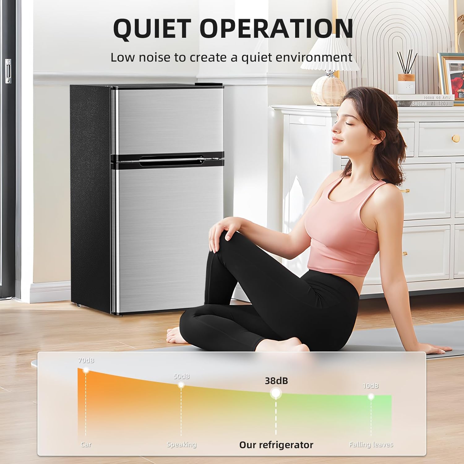 Energy-Efficient & Quiet Operation: Designed with advanced cooling technology, this mini fridge operates efficiently while consuming minimal electricity, helping you save on energy bills. The compressor runs quietly, producing low noise levels that won't disturb your work, study, or sleep—ideal for bedrooms, offices, and dorms. Simply place it in a well-ventilated area away from heat sources, and follow the energy-saving tips (like cooling hot foods before storage) to maximize efficiency.