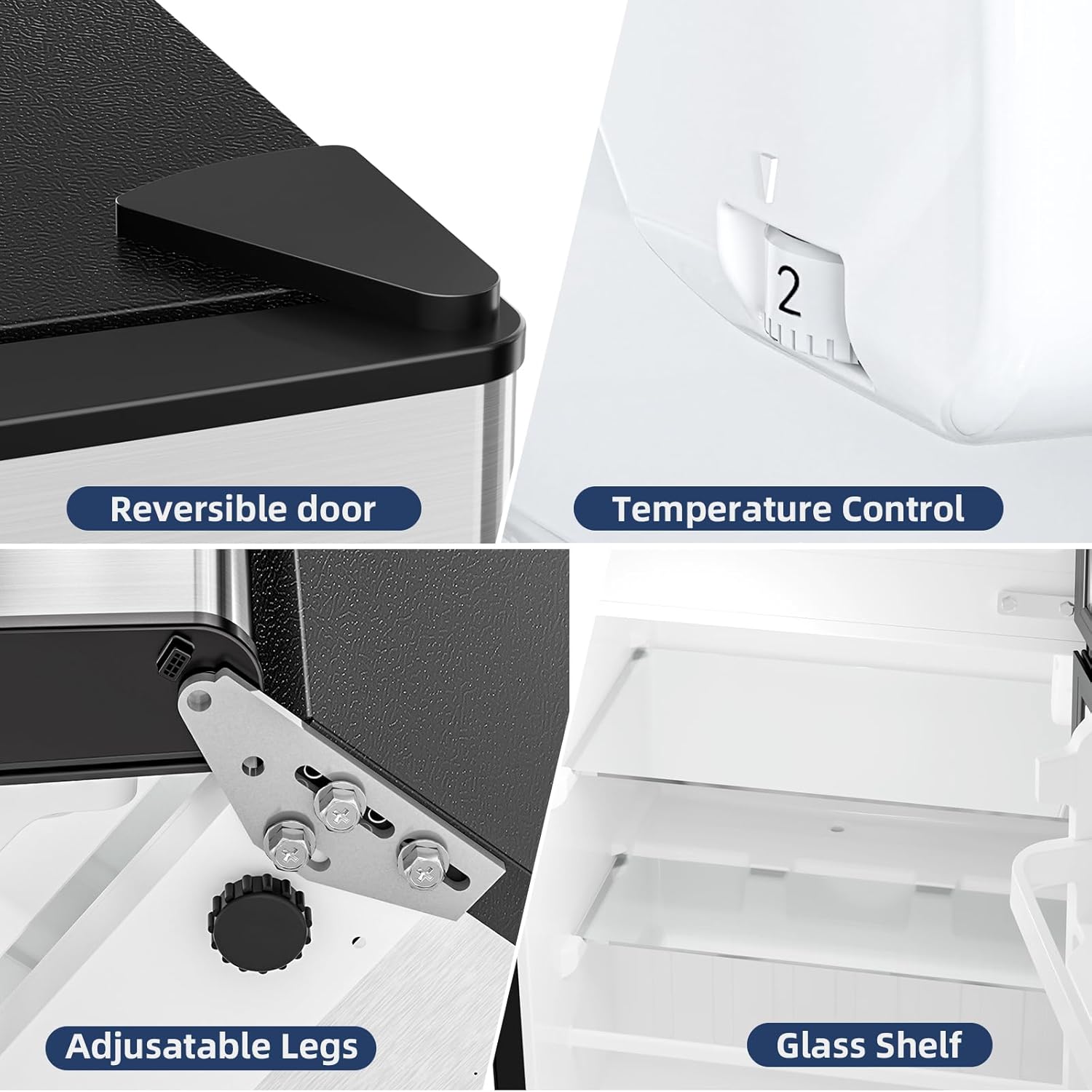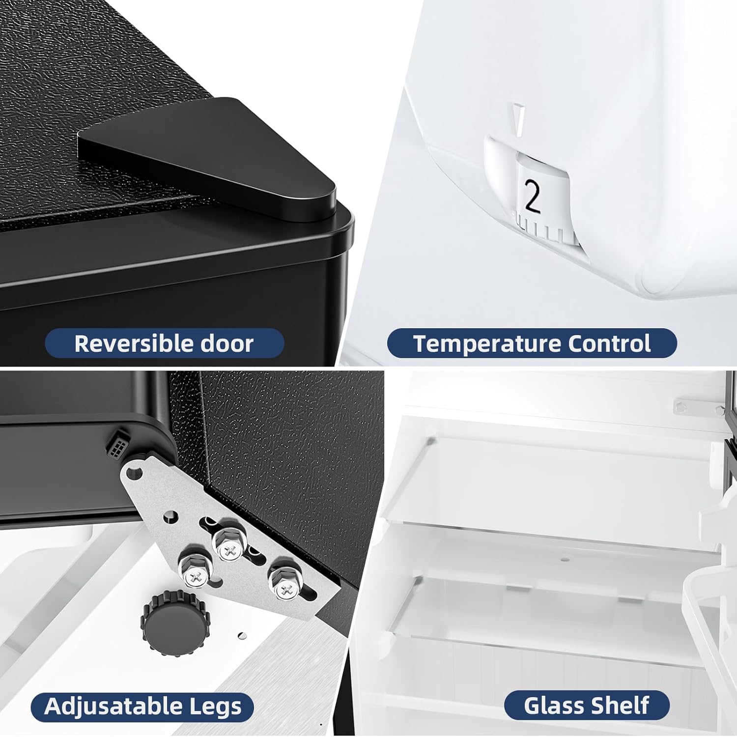 User-Friendly Design with Adjustable Storage: This mini fridge features two sturdy glass shelves in the refrigerator compartment, providing flexible storage options for items of various sizes. The door bin offers convenient space for cans, bottles, and small condiments. Two front leveling legs allow you to balance the unit perfectly on uneven floors, ensuring stability and proper door alignment.