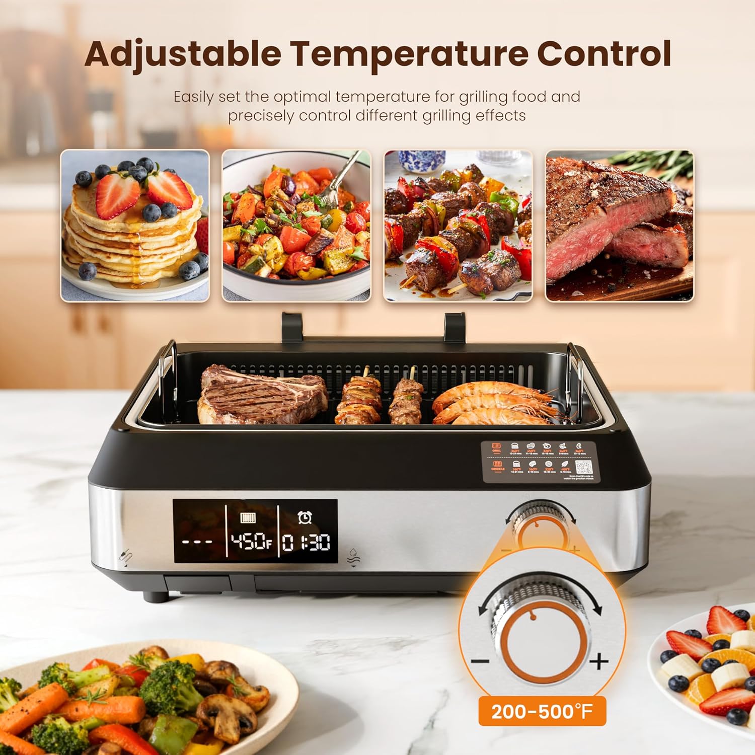 【Precise Temperature Control】Whether you’re gently warming vegetables at 200°F or searing a steak at 500°F, the intuitive knob on tne smokeless indoor grill lets you feel fully in control. Every twist gives you the exact heat you need