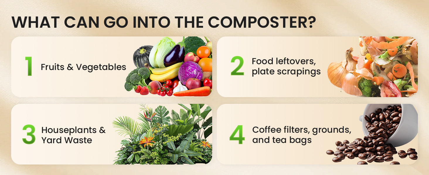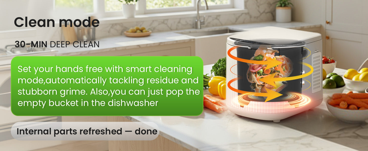 【Auto Cleaning】The composter is equipped with an auto-clean function, a button to clean after use, reducing cleaning and saving your time, and detachable parts are dishwasher-safe for convenient cleaning. Always ready for your next use.
