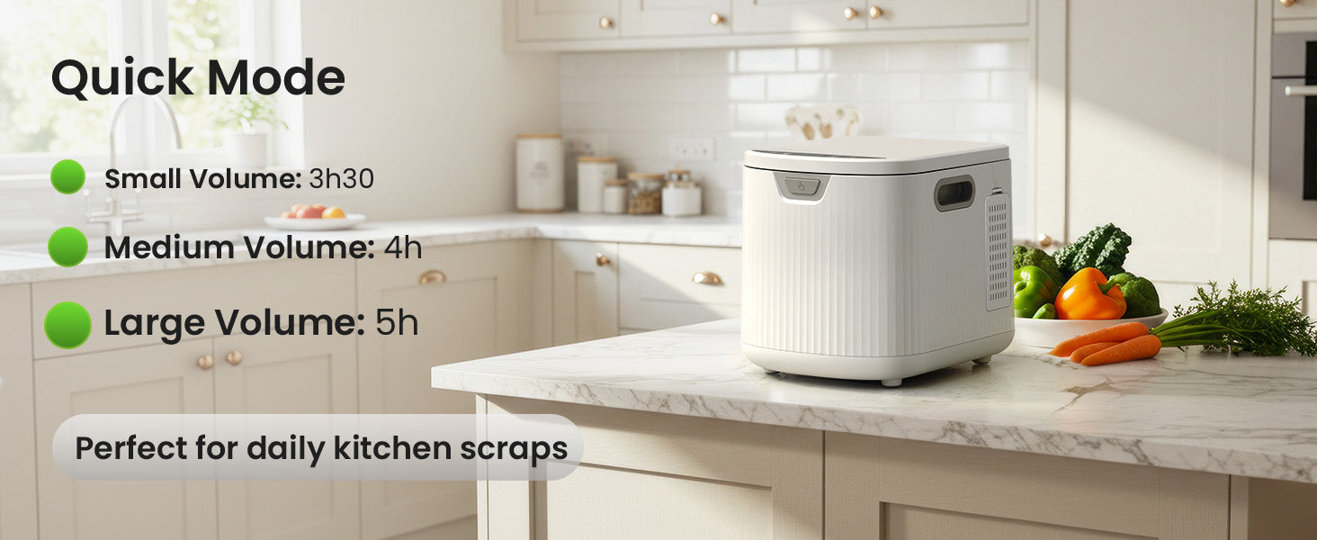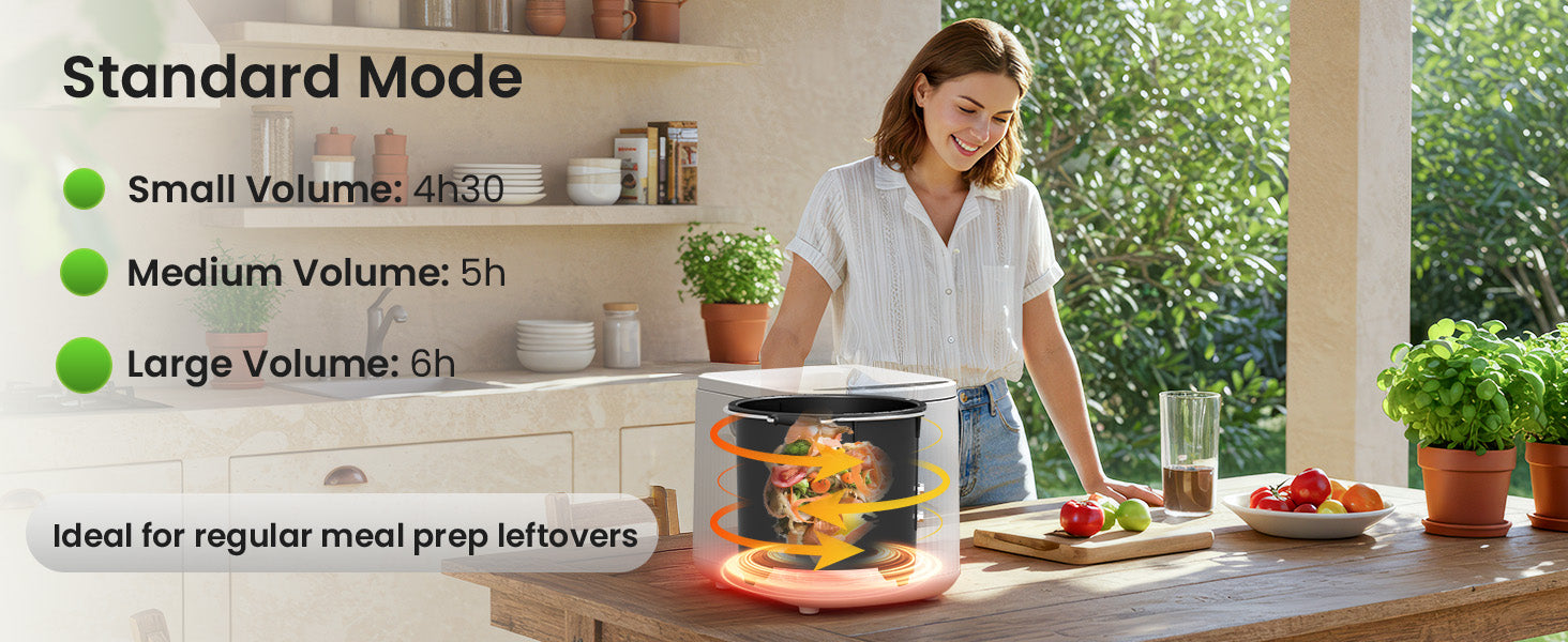 【Easy to use】The composter can switch between Quick and Standard modes at the touch of a button. Enjoy the convenience it brings to your kitchen! Designed for indoor use, it features a simple touch interface and displays real-time remaining processing time for effortless operation.