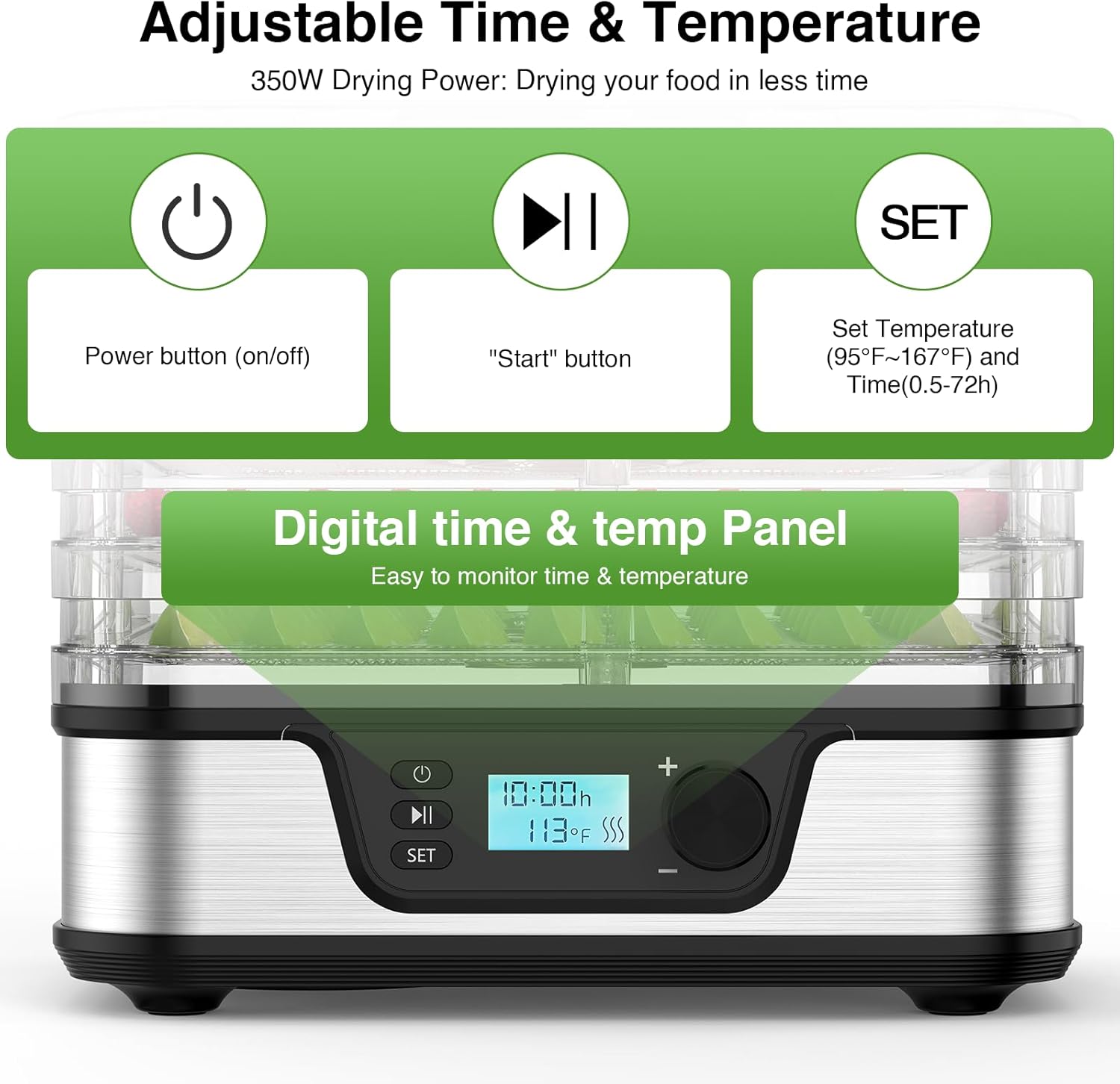 Precise Temperature & Time Control: Features a wide temperature range from 95℉ to 167℉, adjustable in 9℉ increments, and a timer up to 72 hours adjustable in 30-minute steps. Enjoy accurate control to perfectly dehydrate fruits, meats, herbs, and more