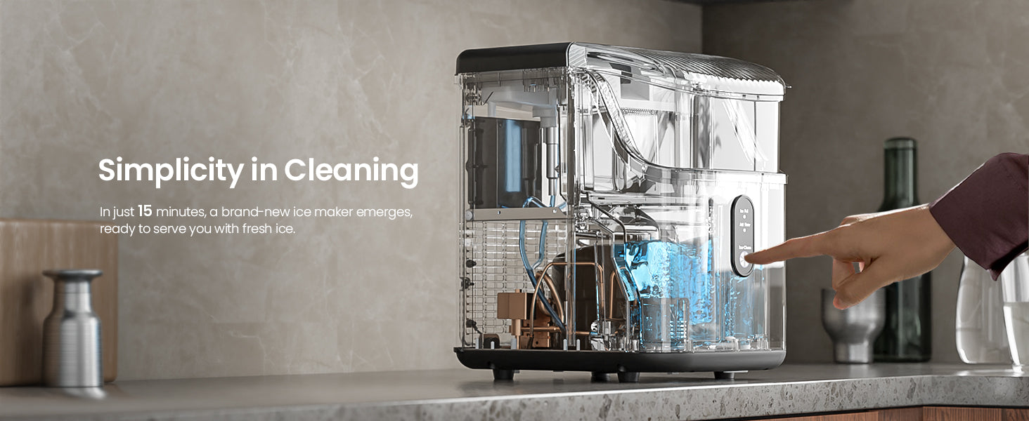 SELF-CLEANING FUNCTION: Press “ICE/CLEAN” button for 5 seconds, the ring indicator light flashes white. It will run the cleaning procedure for 15 minutes and automatically exit. Press this button again during the cleaning procedure and it will exit immediately.