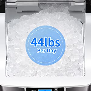 Keeping the water tank full (capacity of 2.4L), it can produce 44lbs of nugget ice in 24hrs. Your family will never run out of fresh ice cubes.