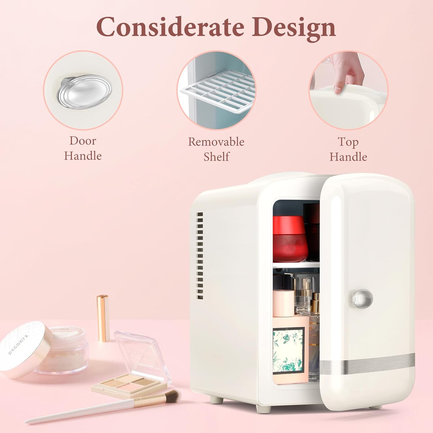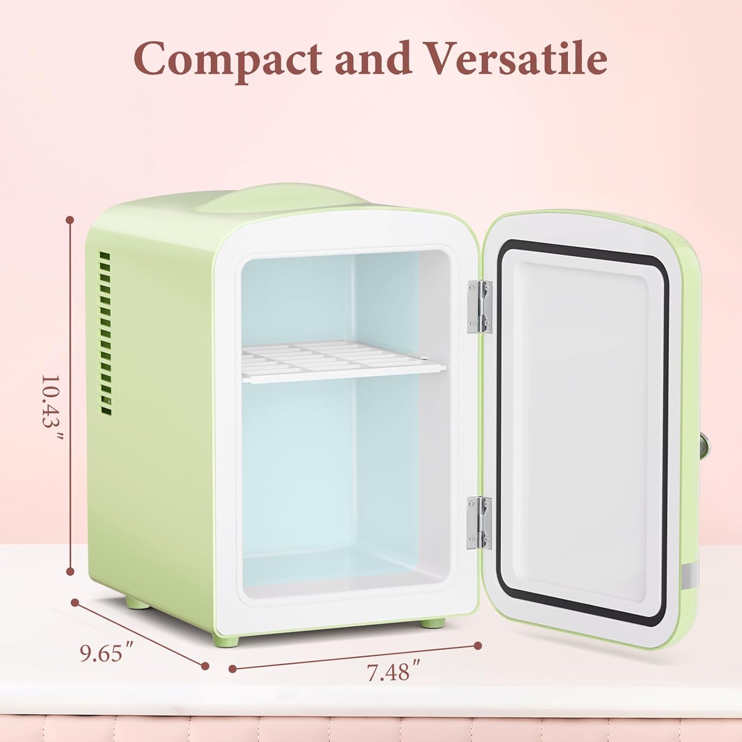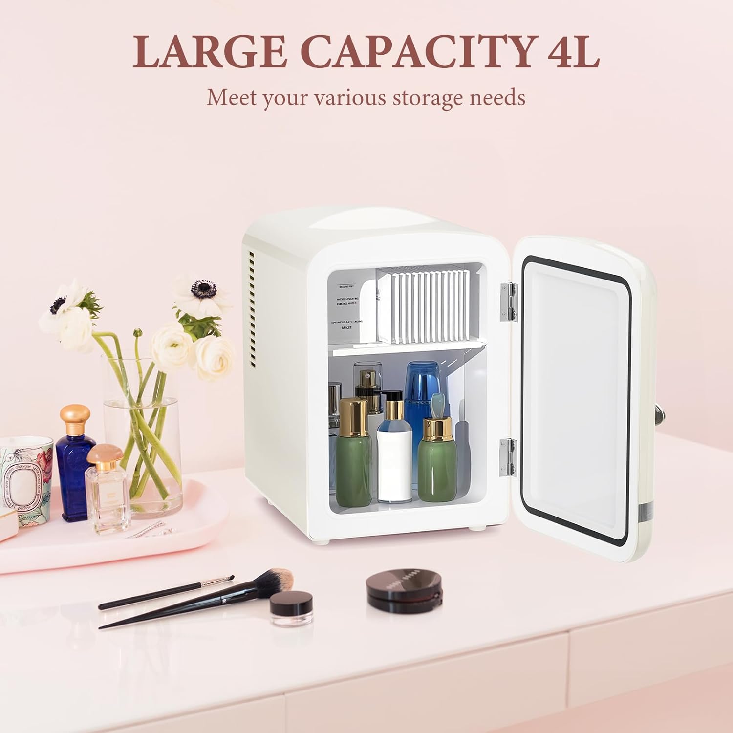 • 【Dual-Temperature Control】This mini fridge supports independent cooling and warming modes. The interior temperature can drop to 32℉ below the ambient temperature in cooling mode, ideal for preserving skincare products and beverages. In warming mode, it can maintain a constant 132℉, perfect for heating milk, warming facial masks, or keeping snacks warm—meeting all your daily storage needs in one compact unit.
